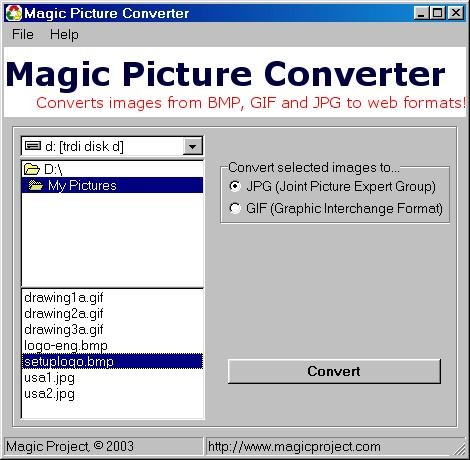 Magic Picture Converter merupakan converter foto digital yang mendukung format BMP, GIF, dan JPG ke web format paling populer. Proses ini dilakukan di Batch mode, yang berarti bahwa Anda dapat mengkonvert semua gambar dalam folder hanya dengan Satu Klik . File-file asli tidak akan dihapus.